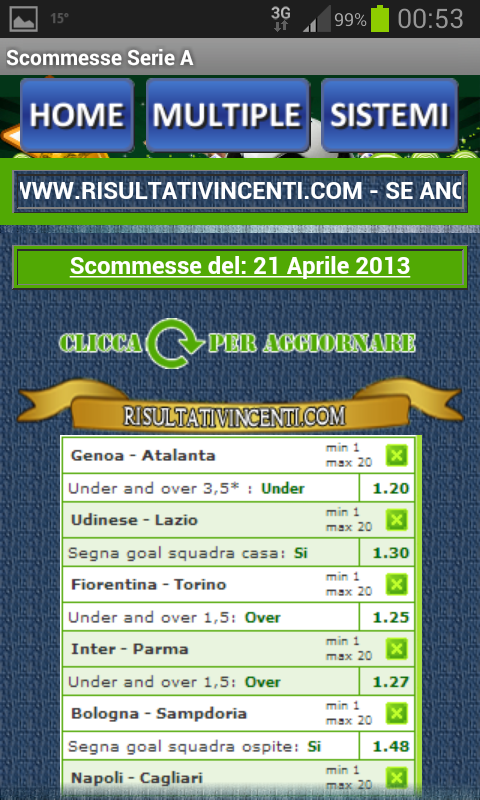 Con questa versione completa di Pronostici Scommesse potrai visualizzare pronostici, scommesse e sistemi integrali aggiornati giorno per giorno, con una grafica semplice ed intuitiva.
