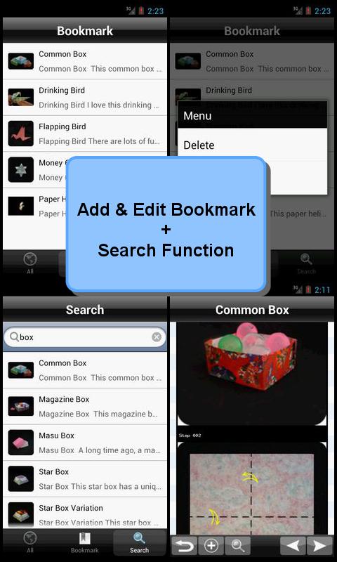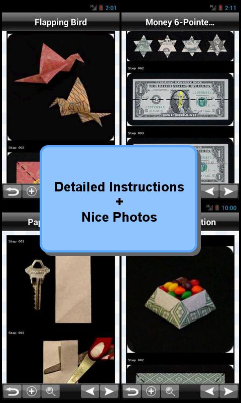 100 Simple Origami is an application containing detailed steps (with illustrations) of folding 100 simple origami objects. The objects are divided into different categories for easier browsing. This is probably the most complete and comprehensive origami guide available in the App Market. This App is a must-have for hobbyists as well as anyone who is interested to learn origami to impress your friends.