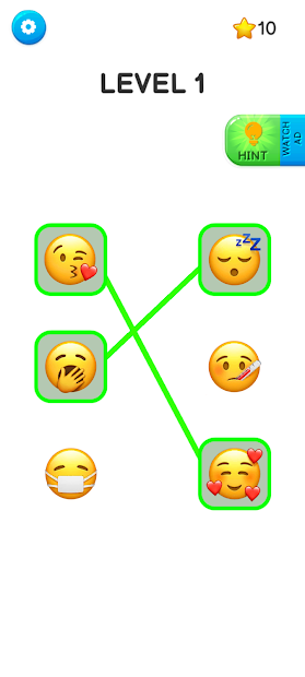 Every level shows you a number of emoji to connect, become the emoji master and solve the matching puzzle. Tap one by one on the elements from different columns to connect them with a line. Or drag to draw a line and connect elements from different columns.