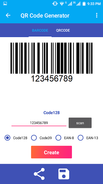 To create a Barcode, enter data (numbers or text) in the text field and click "create". To quickly add data, you can quickly scan the barcode. You can choose 4 Barcode formats.