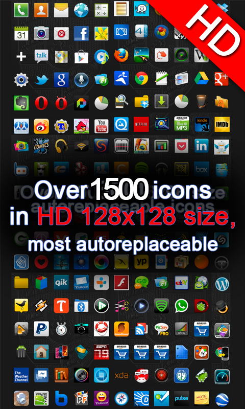 ** Over 1500 icons! with Windows PC themed icons and over 1500 common app icons done all in large 128x128 HD resolution from scratch, instead of the normal 72x72 standard icons commonly used in the themes.