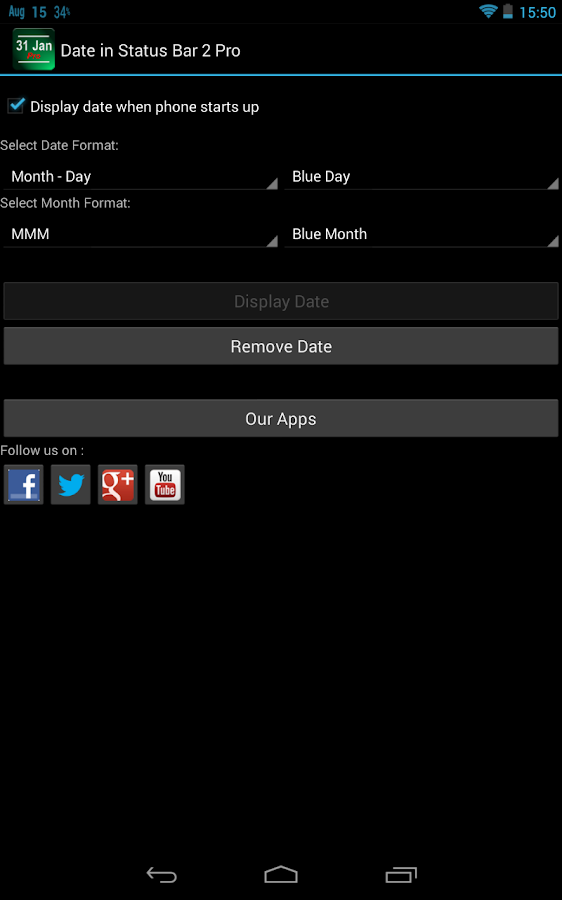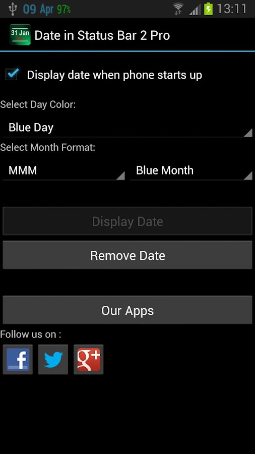 Date Status Bar 2 shows the current day and month in the top status bar. The date fits right in and appears as if its part of the Android OS unlike some apps.