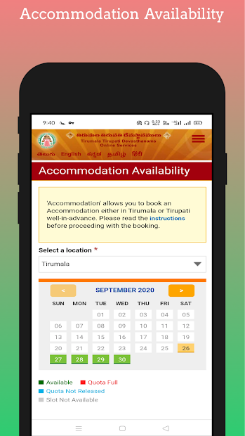 Tirumala Tirupati Devasthanams app (colours of tirupati ) provides services to devotees of Lord Sri Venkateswara, Tirumala. A pilgrim can avail services like Accommodation, Special Entry Darshanam, Hundi, Seva and can be involved in various trusts and schemes that are part of Tirumala Tirupati Devasthanams.