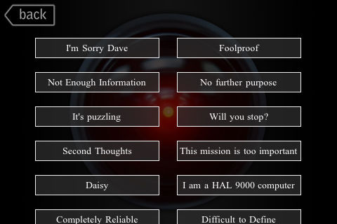 This is the HAL 9000 computer from the movie 2001: A Space Odyssey, right on your iPhone. Just click on HAL's eye and listen to what he has to say. Clicking on HAL's speaker will bring you to the soundboard, allowing you to manually play the best of HAL.