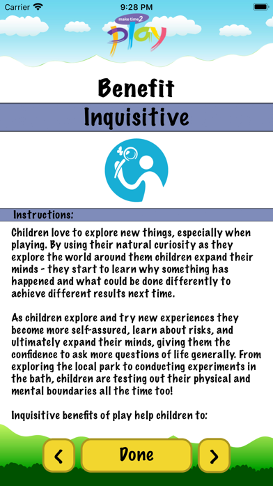 The Make Time 2 Play app is a fun and easy way to find activities to inspire your kids during play time- including lots of games you will remember as a child. The activities have been carefully selected to provide a mixture of physical, emotional, creative, social, behavioural and inquisitive benefits to your children. Symbols on each play activity page will tell you which of these benefits your child is receiving from each game they play.