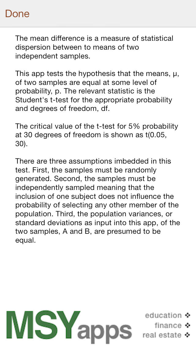 The critical value of the t-test for 5% probability at 30 degrees of freedom is shown as t(0.05, 30). There are three assumptions imbedded in this test. First, the samples must be randomly generated. Second, the samples must be independently sampled meaning that the inclusion of one subject does not influence the probability of selecting any other member of the population. Third, the population variances, or standard deviations as input into this app, of the two samples, A and B, are presumed to be equal.