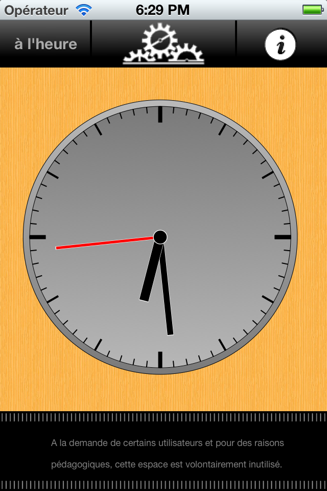 L'application est française et fournit le texte de l'heure :
