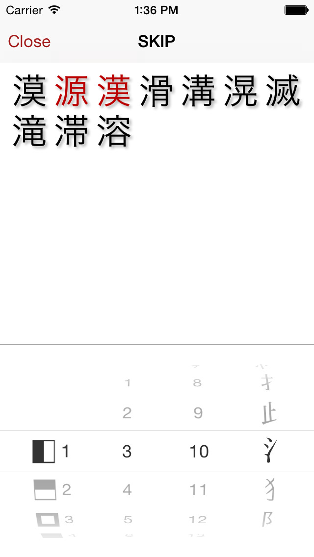 The Kodansha Kanji Learner's Dictionary for iOS covers 2,230 kanji characters, including Jōyō Kanji and Jinmei Kanji, and and gives learners quick access to all the benefits of the print edition, plus additional functionality made possible by the iOS platform, including quick and intuitive interfaces for looking up kanji by SKIP or by radical, the ability to toggle between kana and romaji display for readings, various additional ways to look up kanji or compounds (eg. by on and kun readings, English meaning, or SKIP number), animated stroke-order diagrams, context-sensitive pop-ups, and much more.