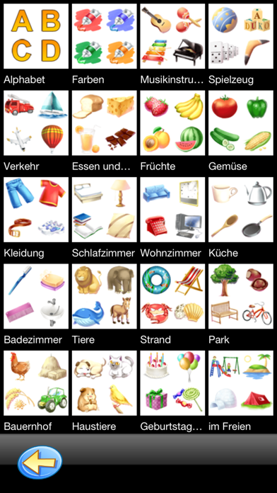 • 24 categories: Alphabet, Colors, Shapes, Numbers, Body, Clothes, Animals, Farm, House, Park, Beach, Food, etc...
