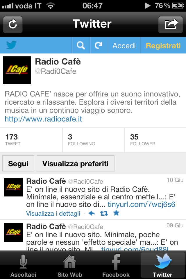 Potrai scoprire la nostra musica, il sito e le pagine Facebook e Twitter di Radio Cafe'.