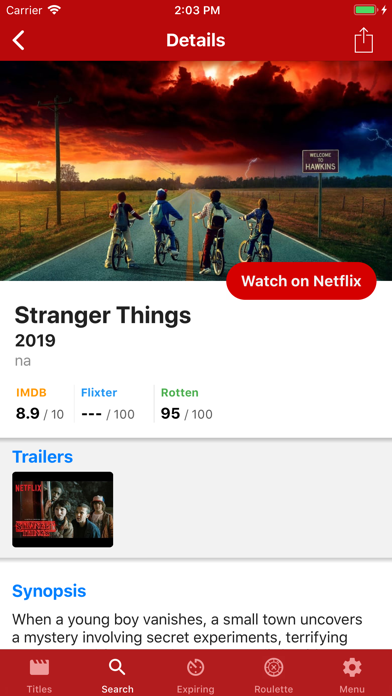 The Roulette Mode helps you choose movies and series on Netflix when you don't know what to watch. Just create your filters based on Netflix categories, Netflix, IMDB and Rotten Tomatoes scores and Upflix will suggest something of your liking.