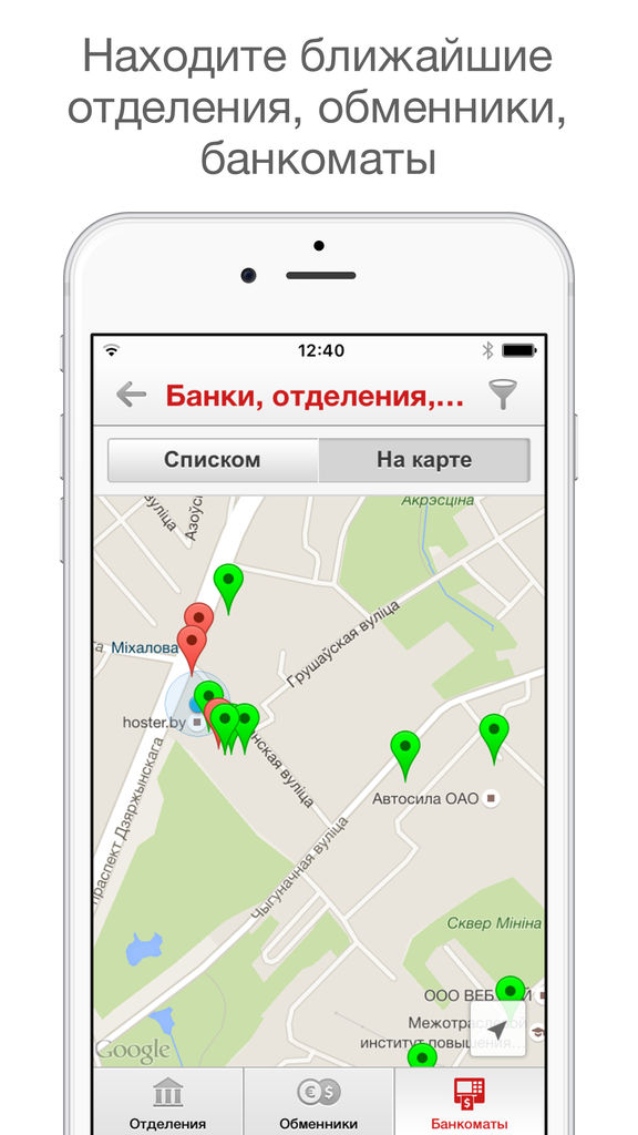 - поиск ближайших банкоматов с учетом банков-партнеров (снятие денег без комиссии), поиск валютных банкоматов, инфокиосков;