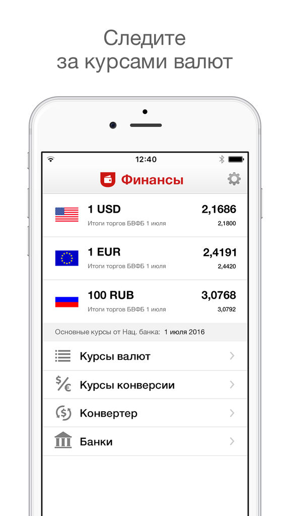 - информация по курсам трех основных валют на завтрашний день, которые становятся известны после торгов на Белорусской валютно-фондовой бирже (доступна на главном экране приложения после завершения торгов);