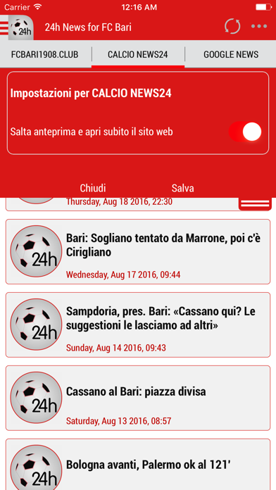 L'unica 24h! La prima 24h! Tutte le altre sono venute dopo! La migliore! FC Bari 24h combina le notizie dei principali giornali e portali web in un'unica applicazione!