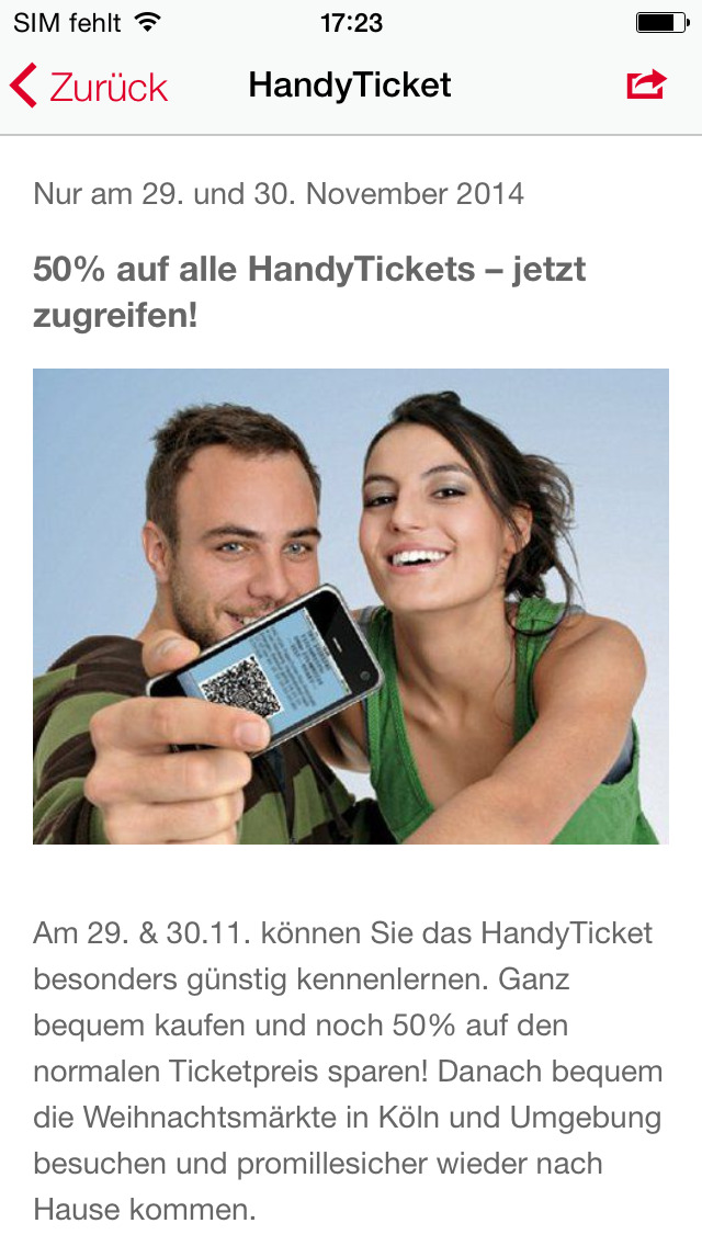 Alle Infos auf dem Handy in der Hosentasche: Als Smartphone-Nutzer können Sie sich in diesem Jahr zum ersten Mal die Mobile-App „Weihnachtsmärkte 2014“ kostenlos aus herunterladen. Die App bietet alle Informationen zu den schönsten Weihnachtsmärkten in Köln, der Region und NRW. Schauen Sie im App-Terminkalender nach den besten Veranstaltungs-Highlights, navigieren Sie über die integrierte Karte zu Ihrem Lieblings-Markt – und nutzen Sie an ausgewählten Tagen das reduzierte Handy-Ticket der Kölner Verkehrs-Betriebe (KVB).