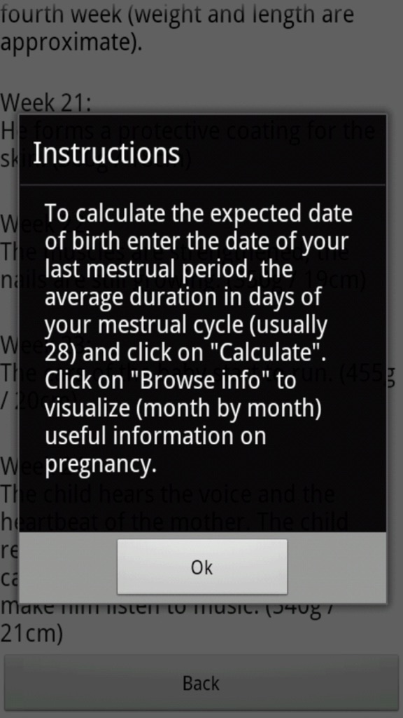 This application calculate the expected date of birth and conception for pregnant women from the date of the last menstrual period and the duration of the menstrual cycle.
