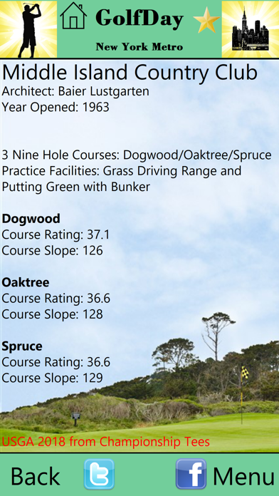 • Course Detail (course architect, year opened, USGA Course Rating/Slope, practice facilities)