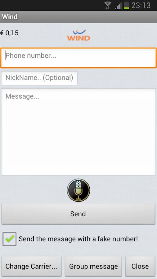 If you are a user Wind will have the option to send sms with a fake number or a nickname!
