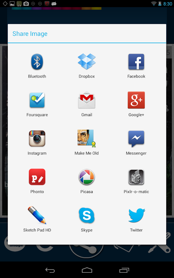 The Sharing feature, helps you to share your photo via facebook, twitter, instagram, picasa, sms, mail, bluetooth or any other sharing platform installed in your device with just on a click.