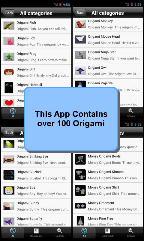 100 Simple Origami is an application containing detailed steps (with illustrations) of folding 100 simple origami objects. The objects are divided into different categories for easier browsing. This is probably the most complete and comprehensive origami guide available in the App Market. This App is a must-have for hobbyists as well as anyone who is interested to learn origami to impress your friends.