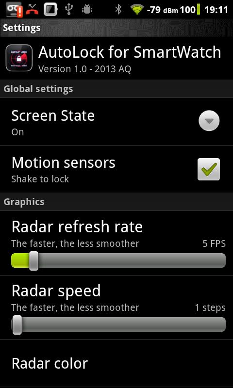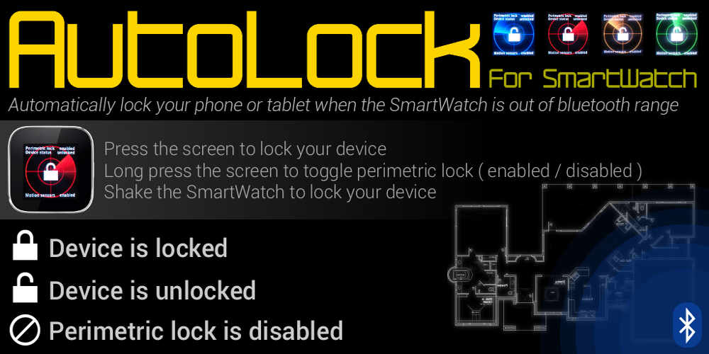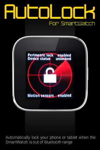 AutoLock is an Android extension for SmartWatch that automatically lock your phone or tablet when the SmartWatch is out of bluetooth range. In range, it allows you to monitor your device lock status and instantaneously lock it on request, remotely from your SmartWatch.