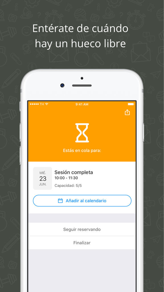 - Recibe notificaciones cuando un aparece un hueco libre en la sesión que andabas buscando.