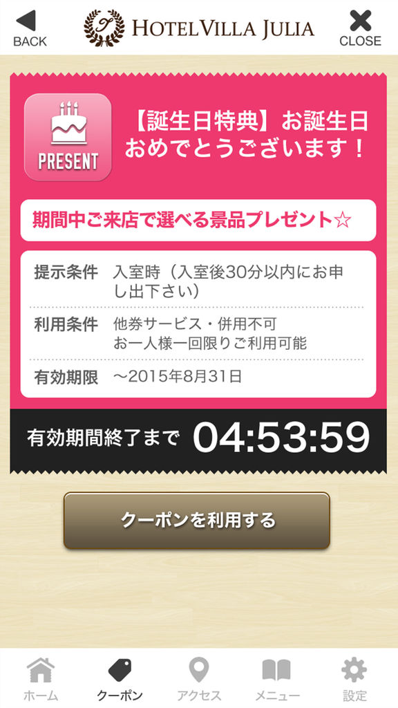 ●上記の誕生日クーポンは誕生日月に配信されるもので、アプリインストール時には発行されません。(クーポンを受ける為には、ユーザー側で任意の誕生日入力が必須となります)
