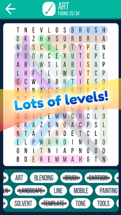- Difficulty increases along with levels: this wordsearch puzzle starts easy and becomes challenging!