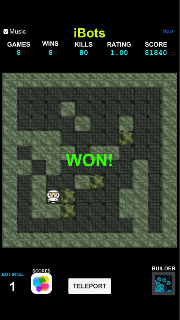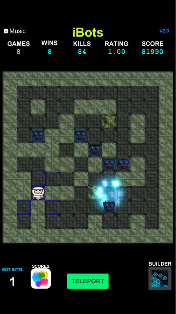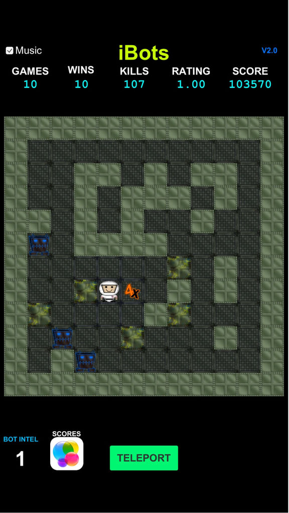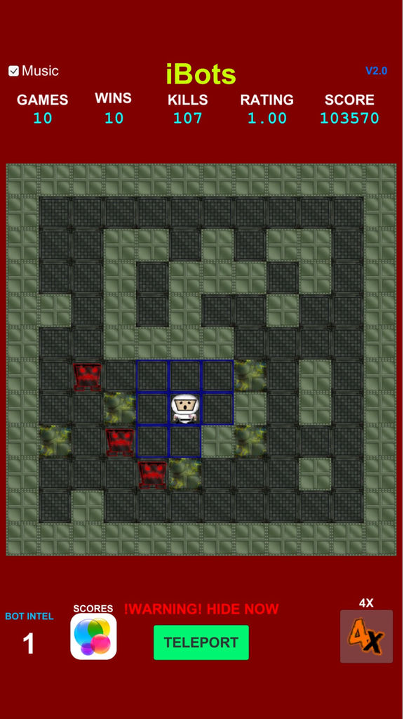 iBots is a simple turn-based strategy game. You make a move first and then the iBots will make their move. The cycle repeats until all iBots are destroyed or until they catch you. There are several power-ups that randomly appear in the maze. Power-ups will help you defeat the iBots.