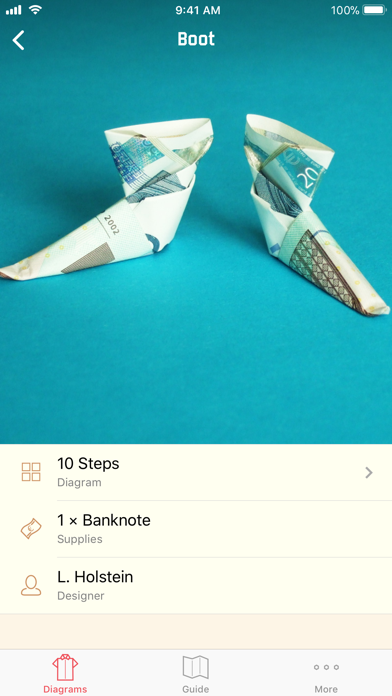 The instructions don't work with US dollar bills, but with Euro bills, Canadian dollar bills, Pound sterling banknotes or just use a 2:1 ratio rectangle. For dollar bills see my other App "Dollar Bill Origami".