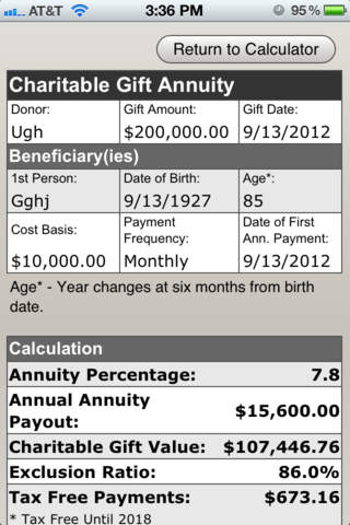 Run calculations for a charitable gift annuity, deferred gift annuity, charitable remainder unitrust, annuity trust or lead trust. Just enter your donor information and view the answers anytime, anywhere.