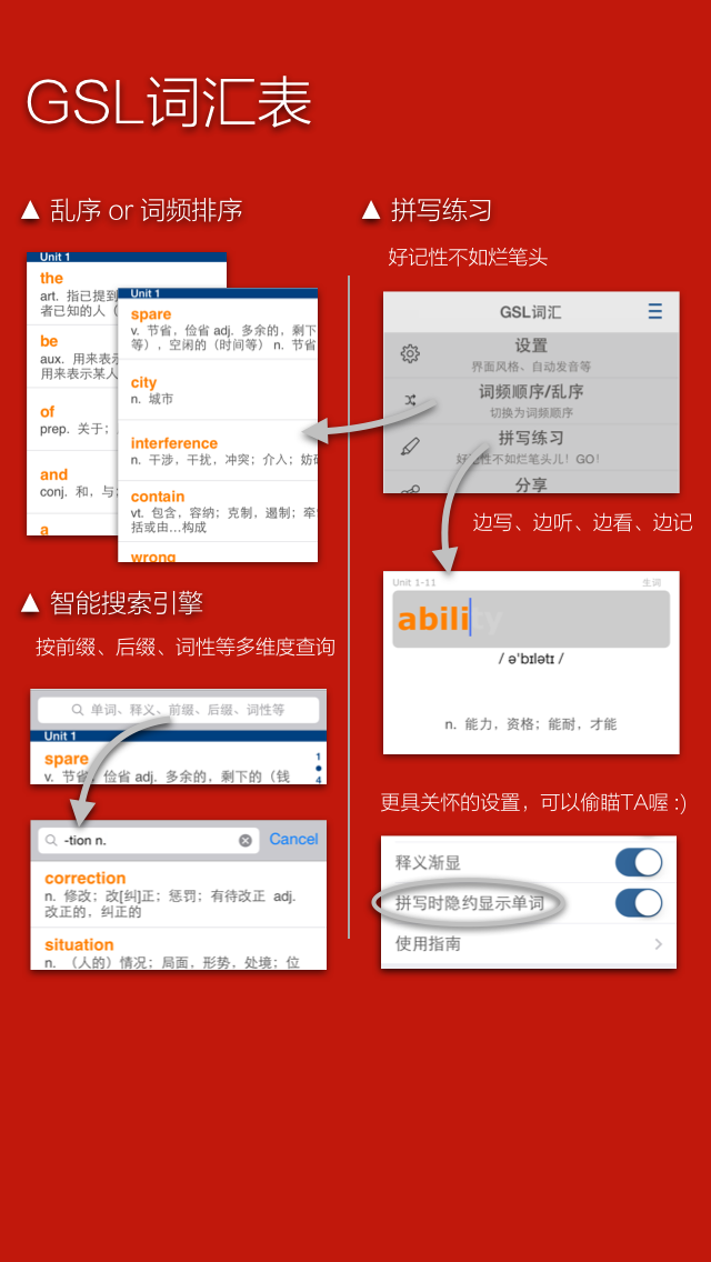 This application contains 2284 GSL words. In the word view page, you can see the word, pronunciation , Chinese meaning. Spelling practice function is also provided in this version. Have a good study time!
