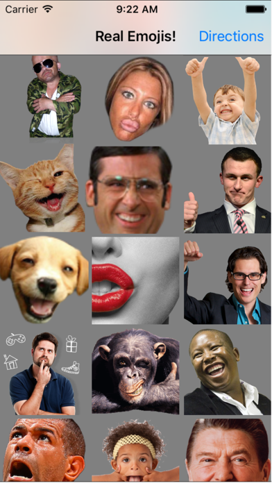 Liven up your messages! Real Emojis brings you hundreds of real faces showing real emotions giving you the next generation of Emojis. Use these unique emojis in the same ways you use emojis today. Share via Text, Twitter, Facebook, etc. or copy them into any of your favorite apps. You can even save the Real Emojis to your image library and use them in your own unique ways.