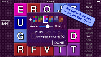 Multiple game variations are provided, based on the length of the words that must be found. In the free version, you have 1 minute to find as many words as you can. (The full version of the app also allows 3 minute and 5 minute games, as well as an un-timed mode where you can look for words as long as you want.) Several different color schemes are provided for variety, and you can even create and import your own color schemes using the Pattern Artist app (or Pattern Artist Free).