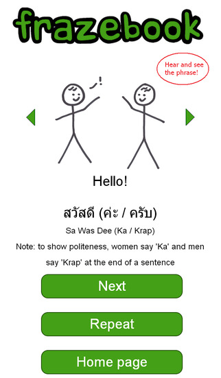 Learn basic Thai phrases through short illustrated stories with text and audio recorded by a native Thai speaker. Four different sections cover Greetings, Next Steps, Simple Food and Numbers. Simply play the stories through, listening to the phrases until you start to learn them! Perfect for quickly learning the basics of Thai before a trip to Thailand. All phrases can also be listed, creating an instant phrase book with over 40 phrases.