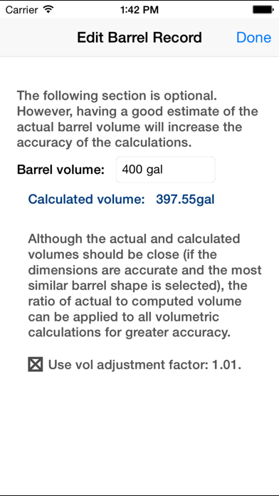 Three barrel types (parabolic, elliptical, spindle) are provided to assist with fitting a standard barrel model to the actual shape. For increased accuracy an optional adjustment factor can be used to adjust all volume calculations to the correct barrel volume.