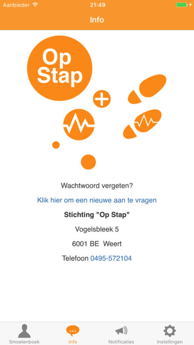 De Stichting "Op Stap" stelt zich als doel een bijdrage te leveren aan goede communicatie en samenwerking binnen de regionale gezondheidszorg in de regio Weert en is er van overtuigd dat professionals elkaar daarvoor moeten kennen en elkaar moeten kunnen bereiken. Deze app ondersteunt dat op een directe en simpele manier. Alleen voor gebruikers met een inlogcode.